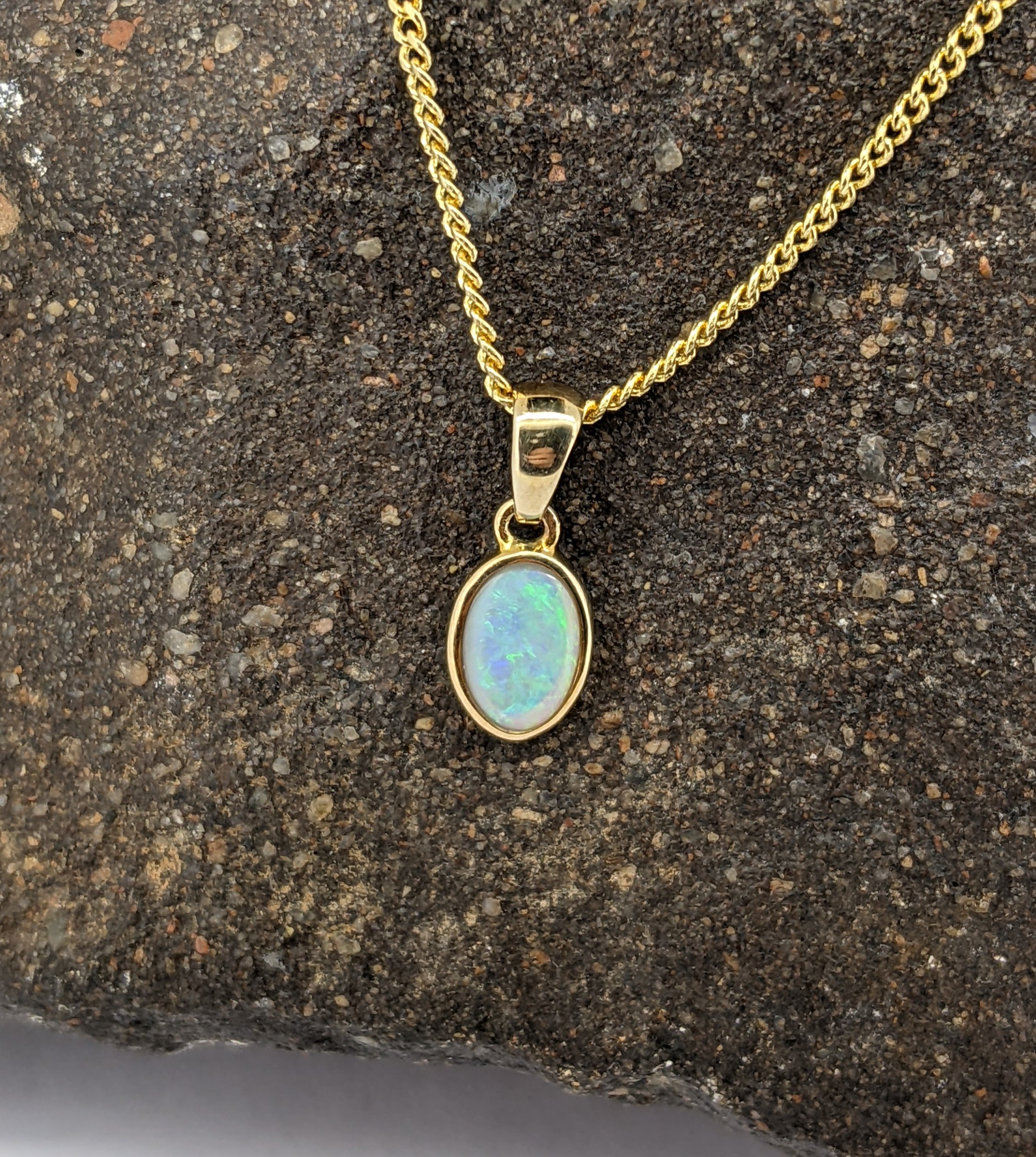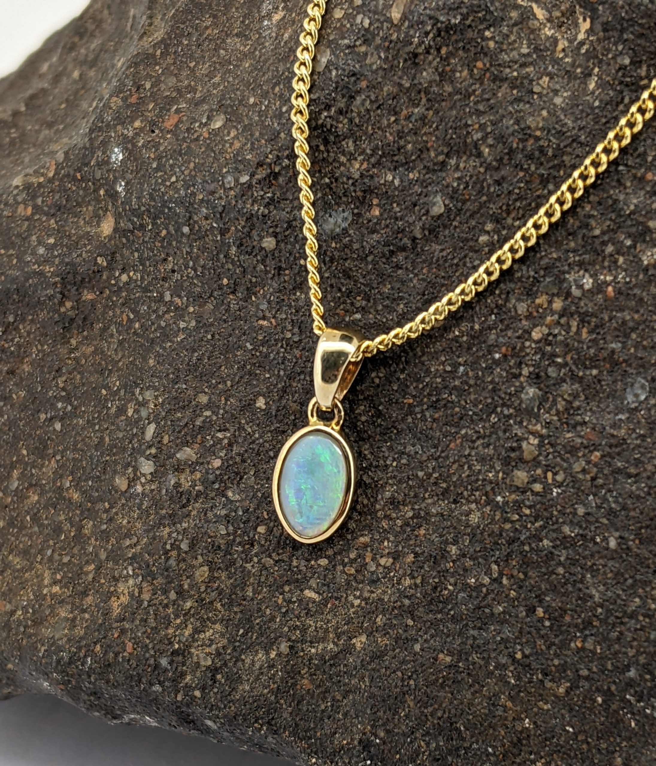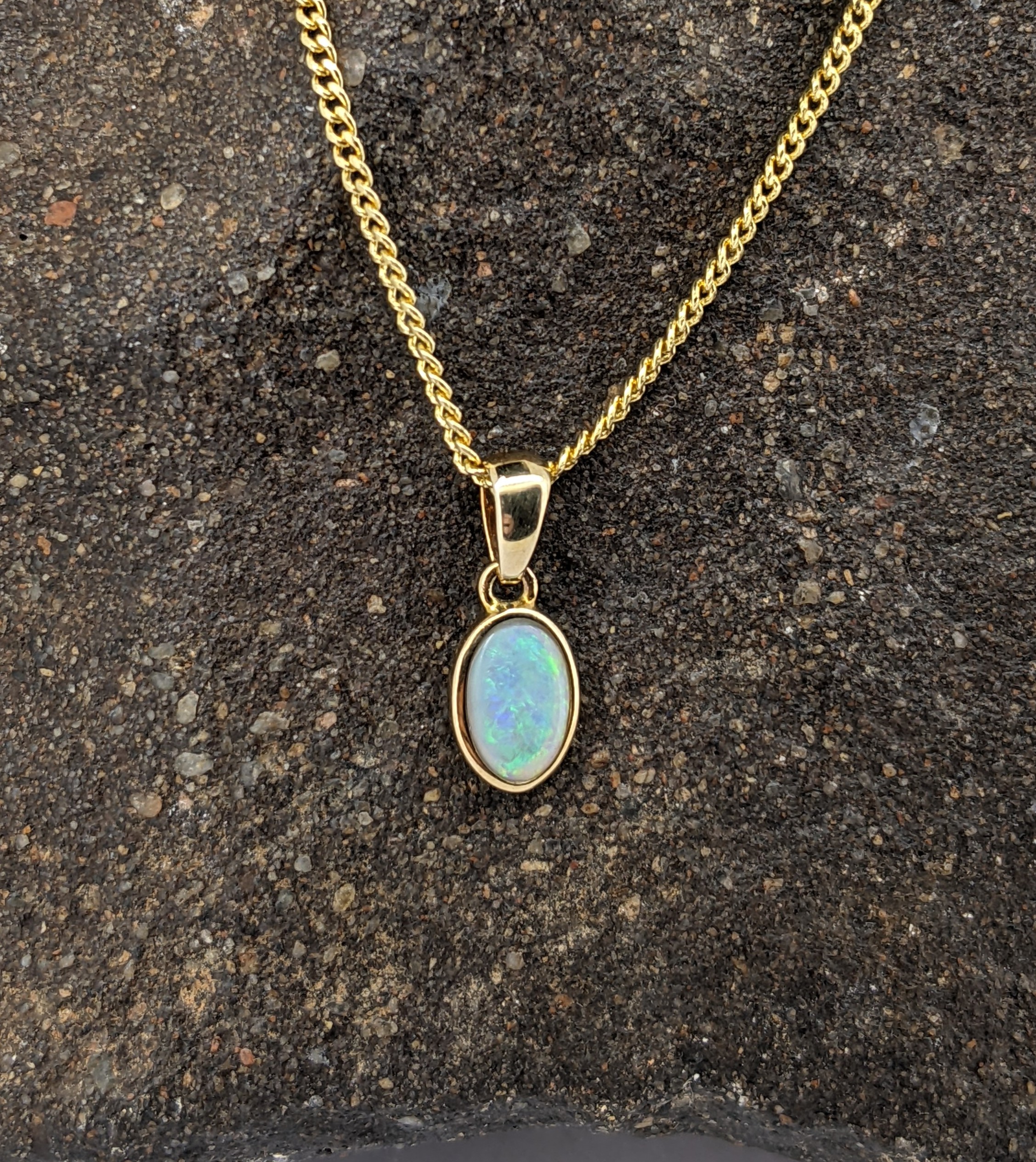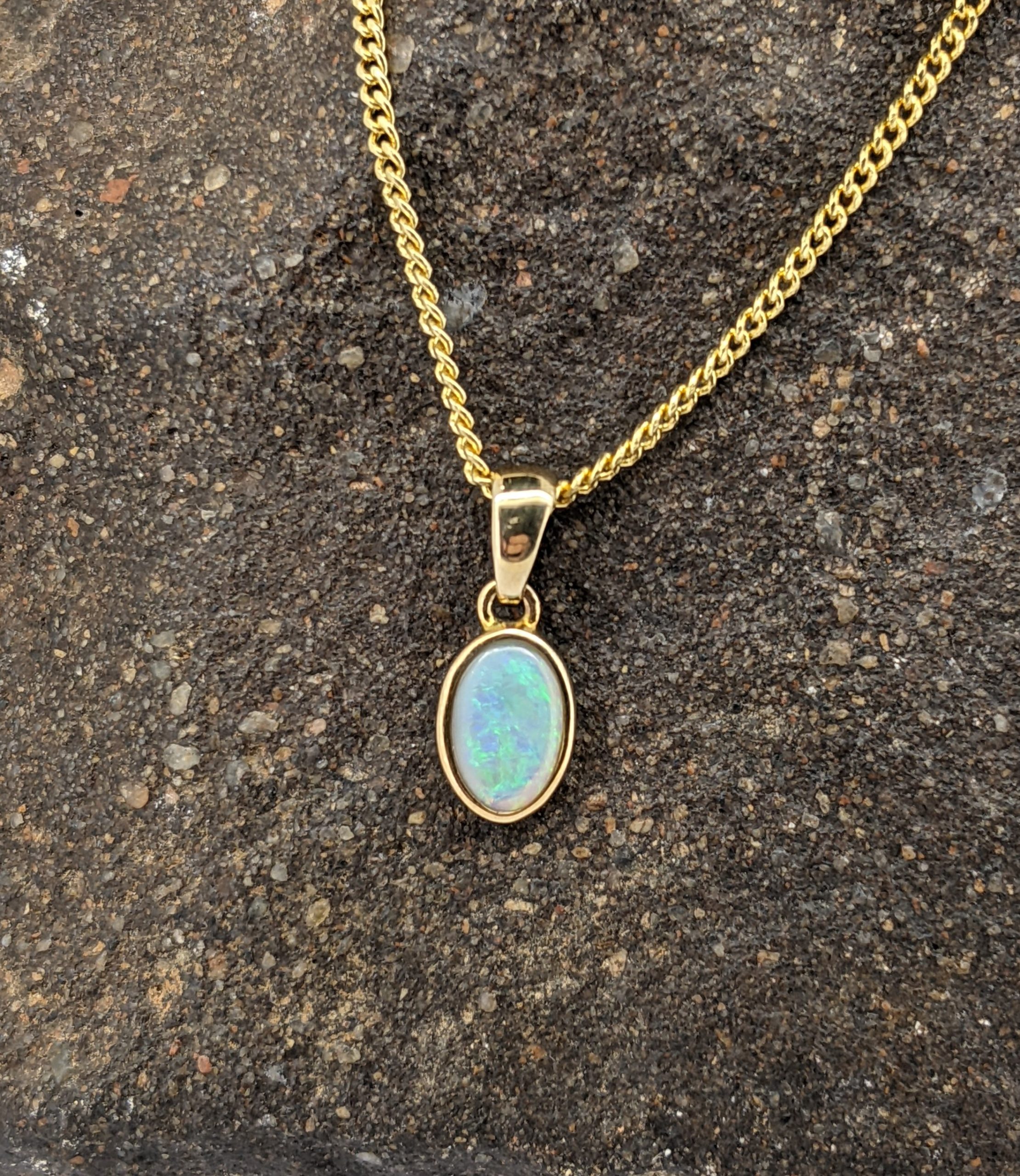 Solid natural white opal sourced from Coober Pedy, South Australia. This solid white opal pendant is set in 9K Yellow Gold. The opal has a fiery display of the colours green and blue.