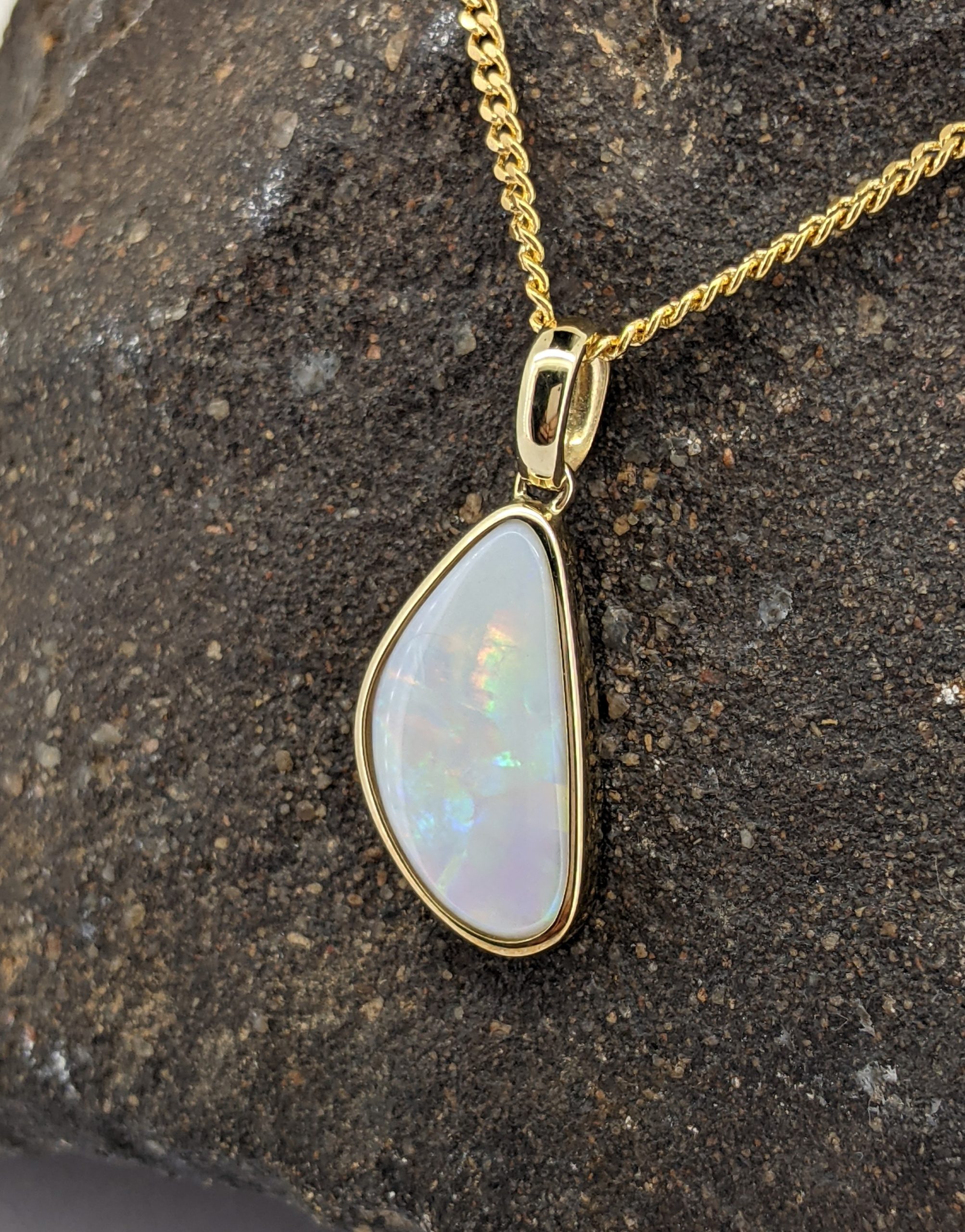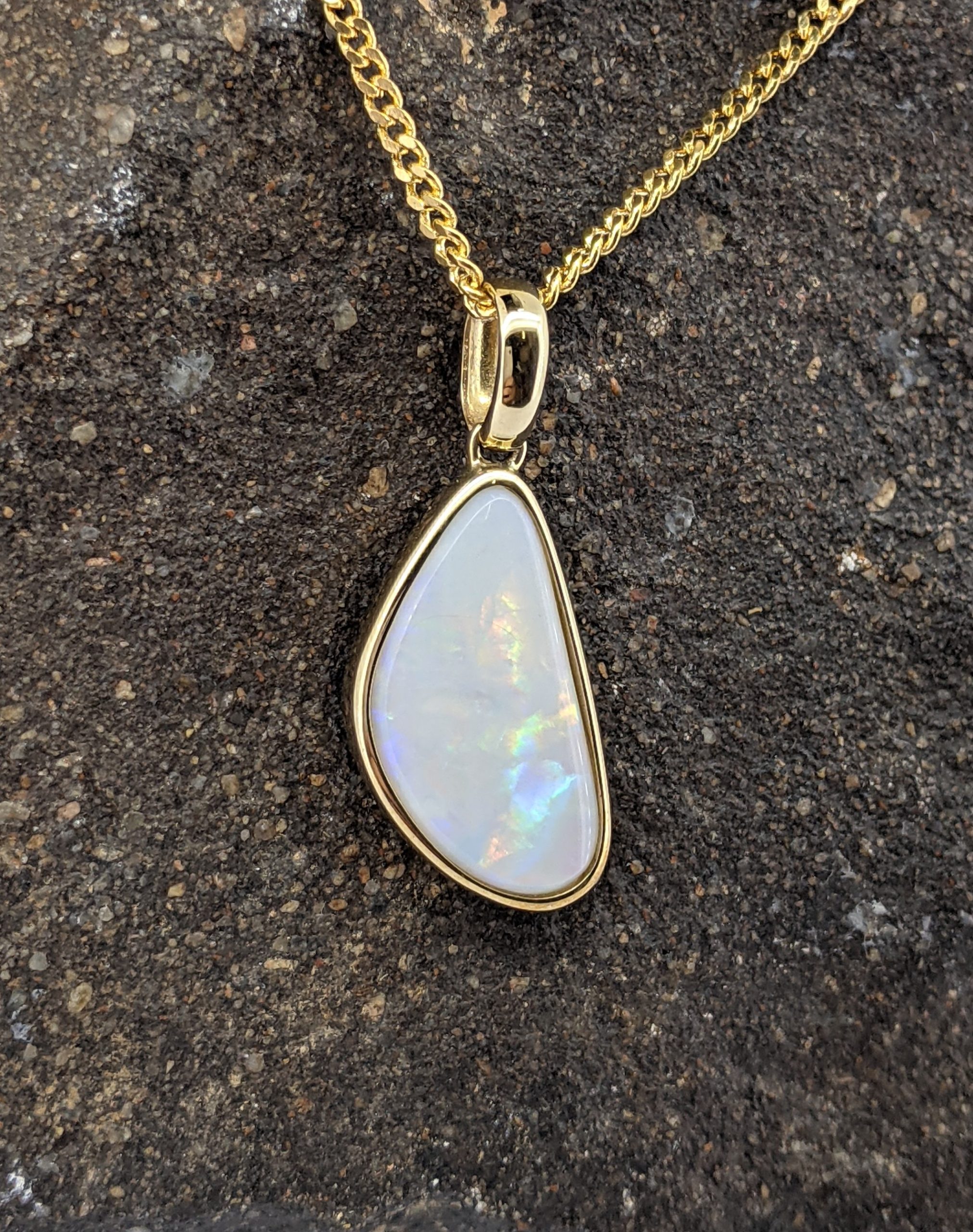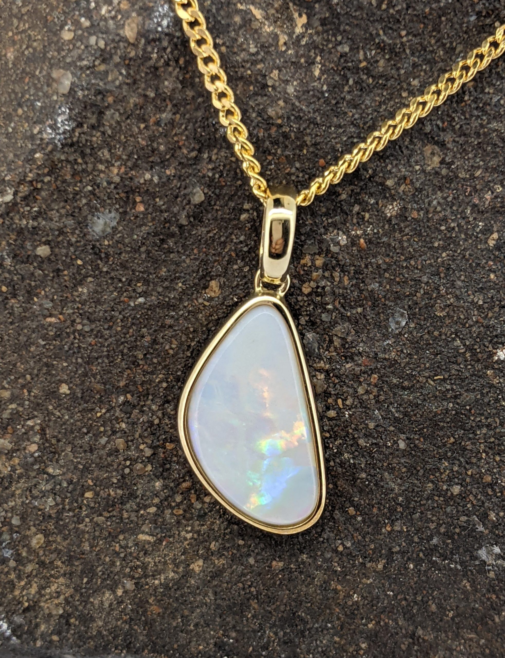 Solid natural white opal sourced from Coober Pedy, South Australia. This solid white opal pendant is set in 9K Yellow Gold. The opal has a fiery display of the colours red, yellow, green and blue.
