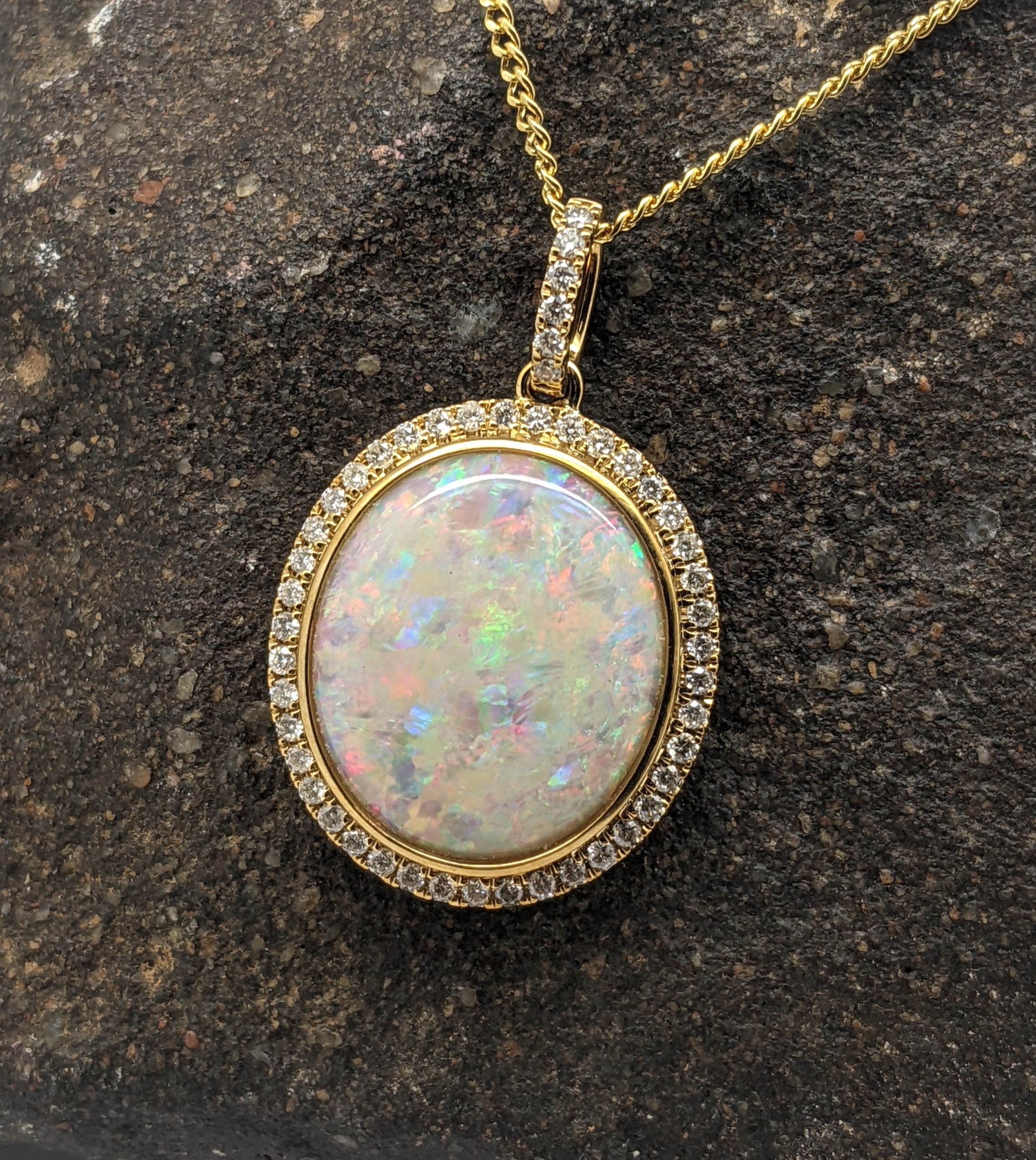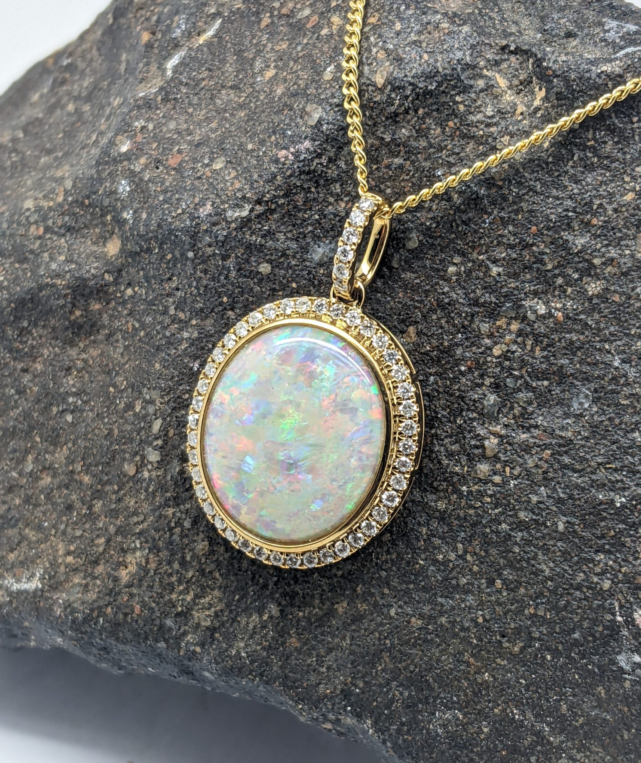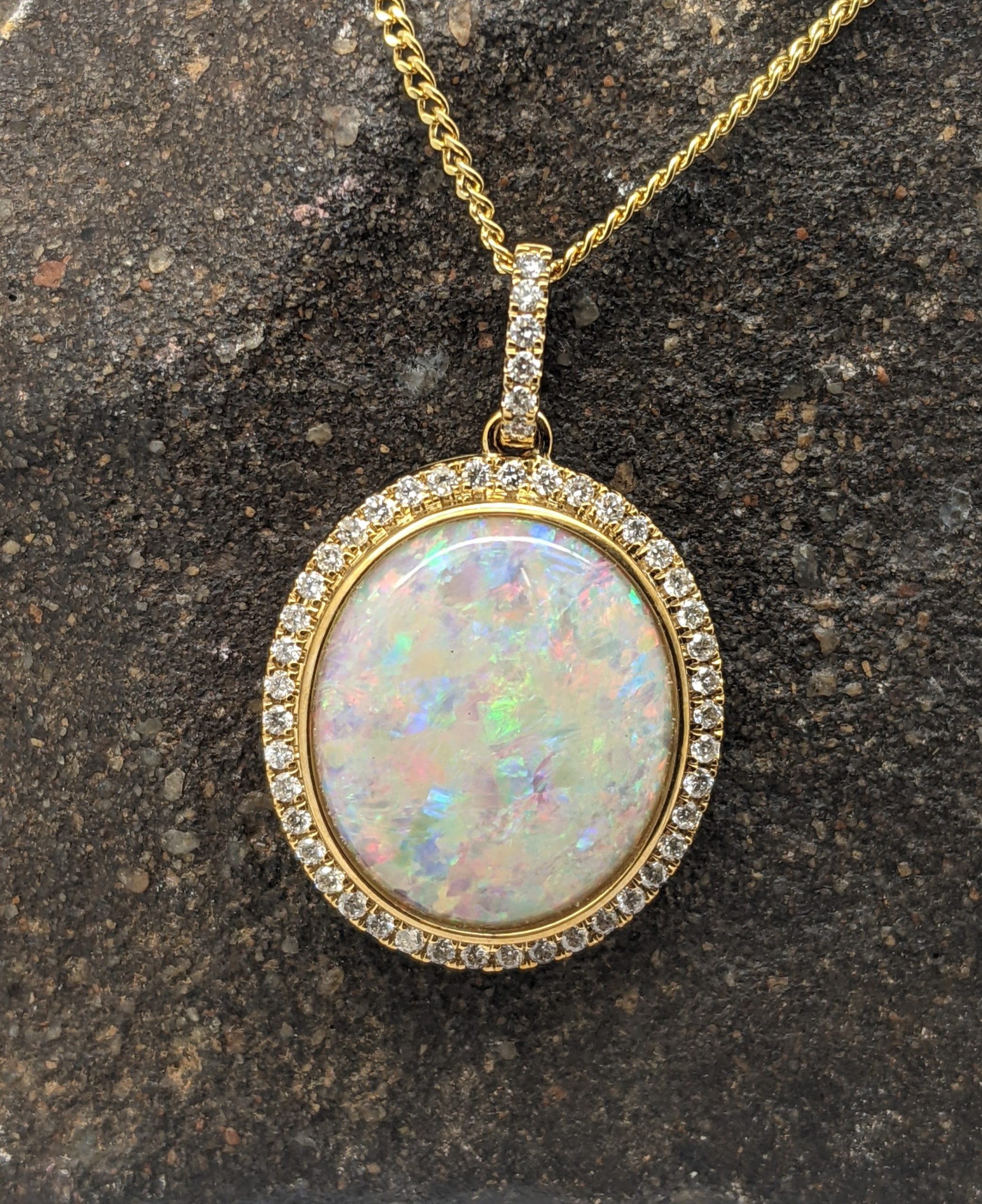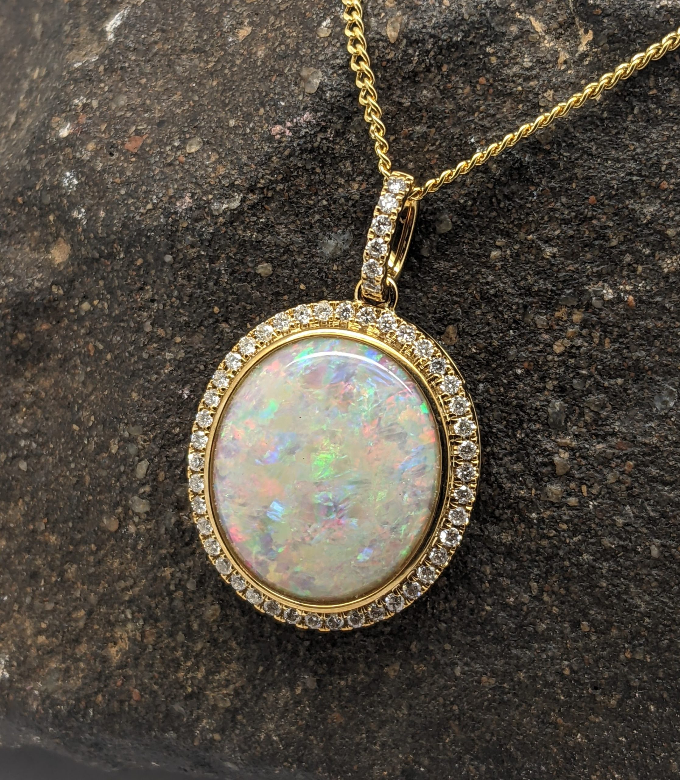 Solid natural white opal sourced from Coober Pedy, South Australia. This solid white opal pendant is set in 9K Yellow Gold. The opal is surrounded by 48 diamonds. The opal has a vibrant display of the colours red, green and blue.