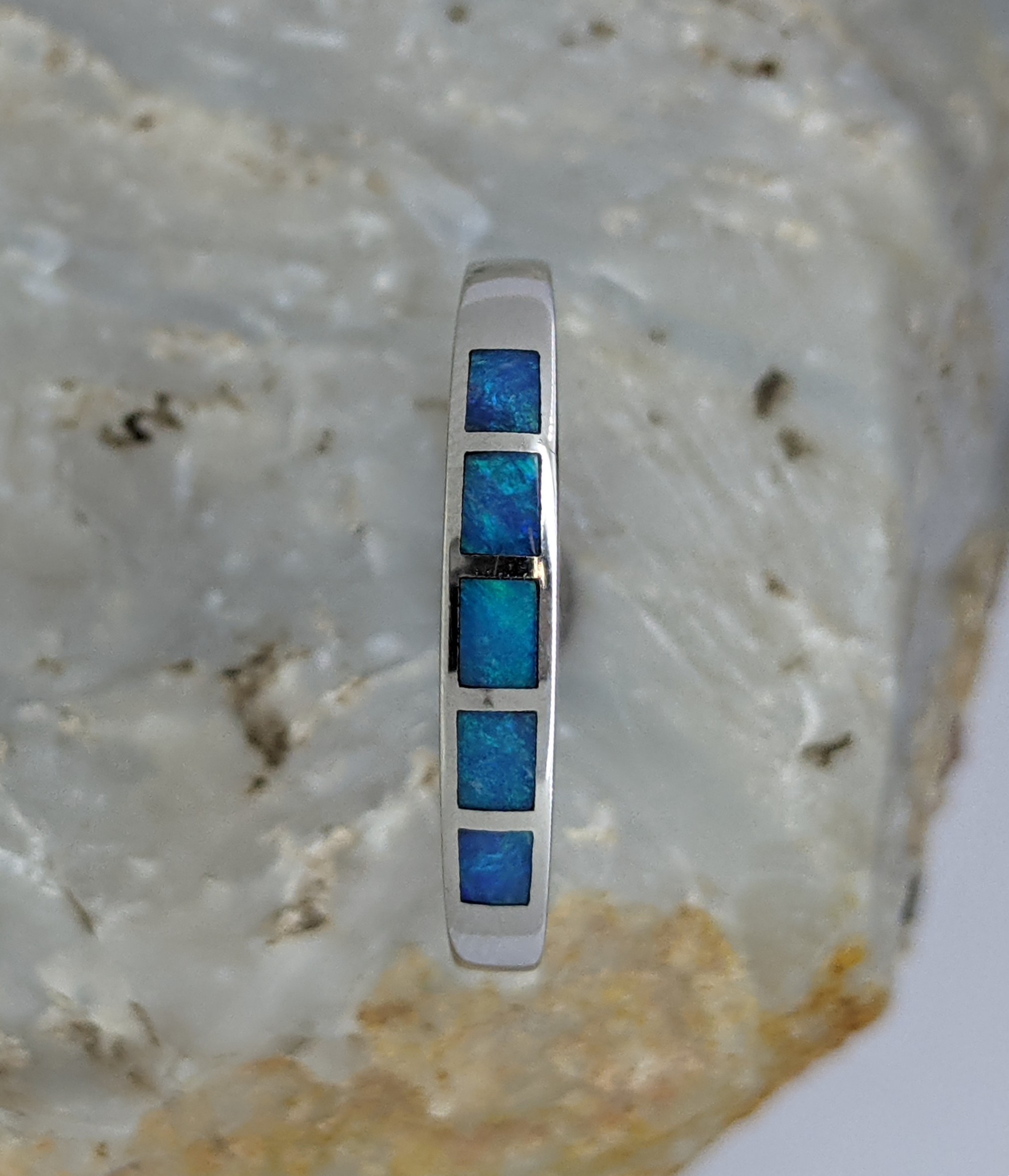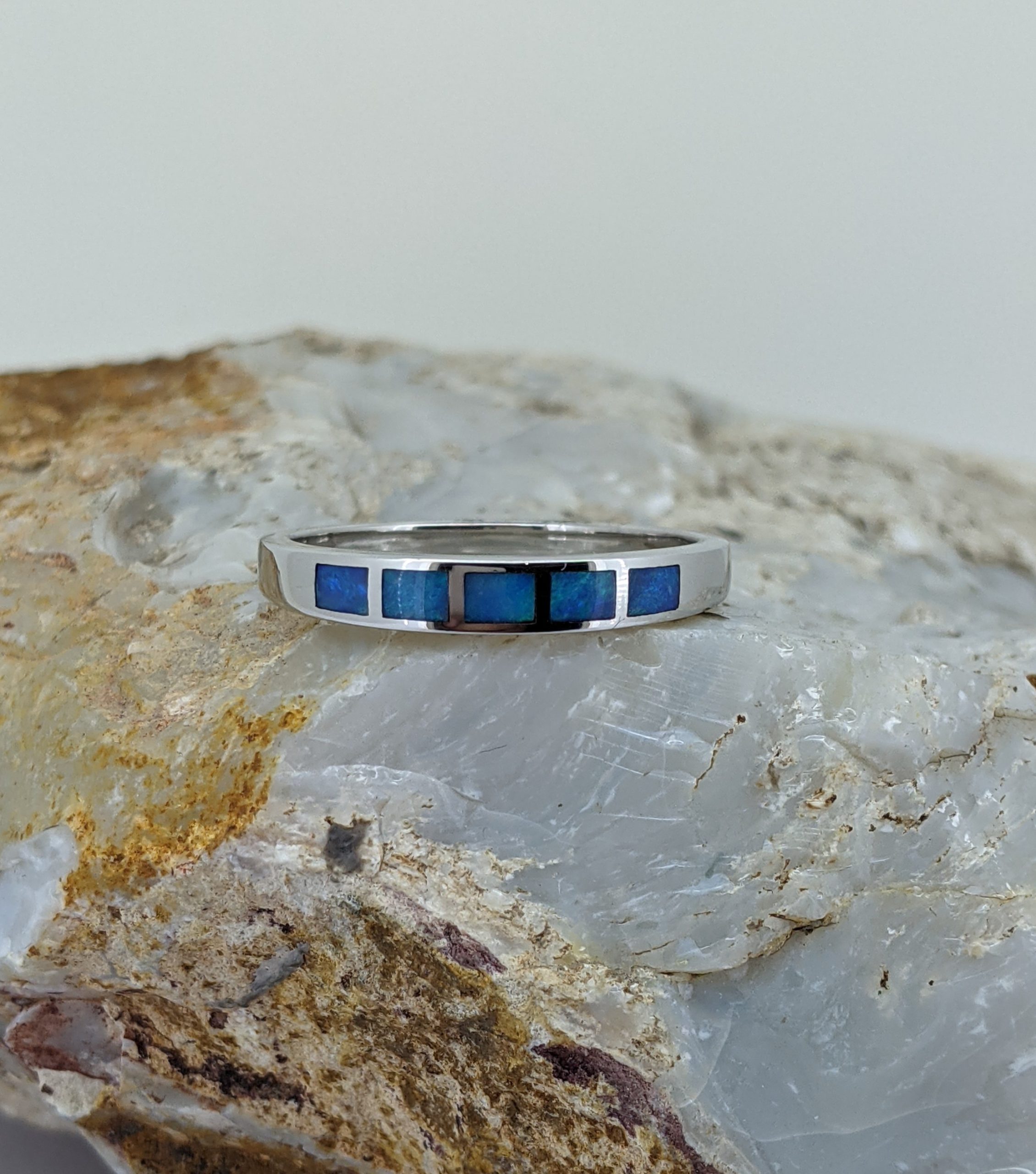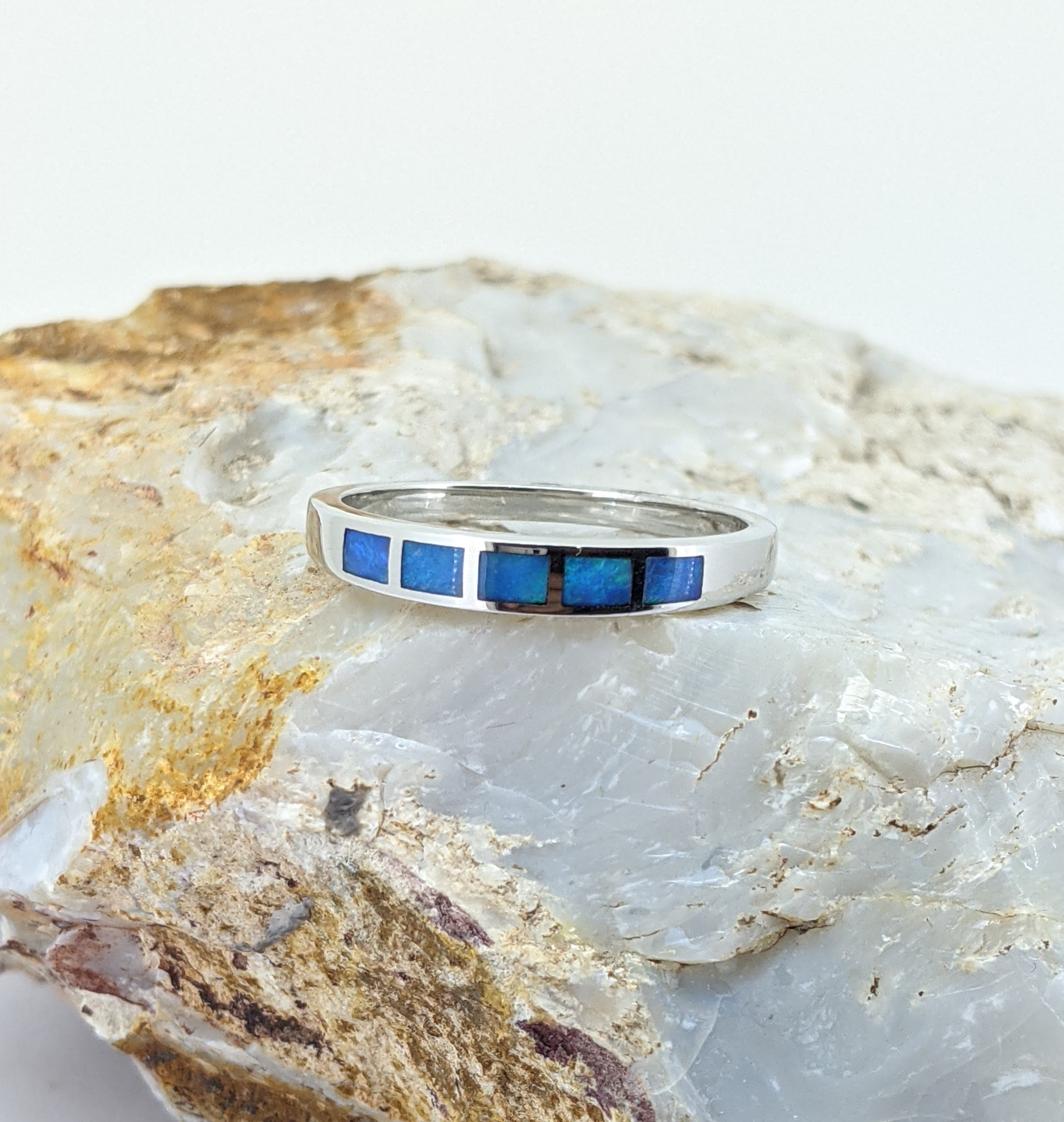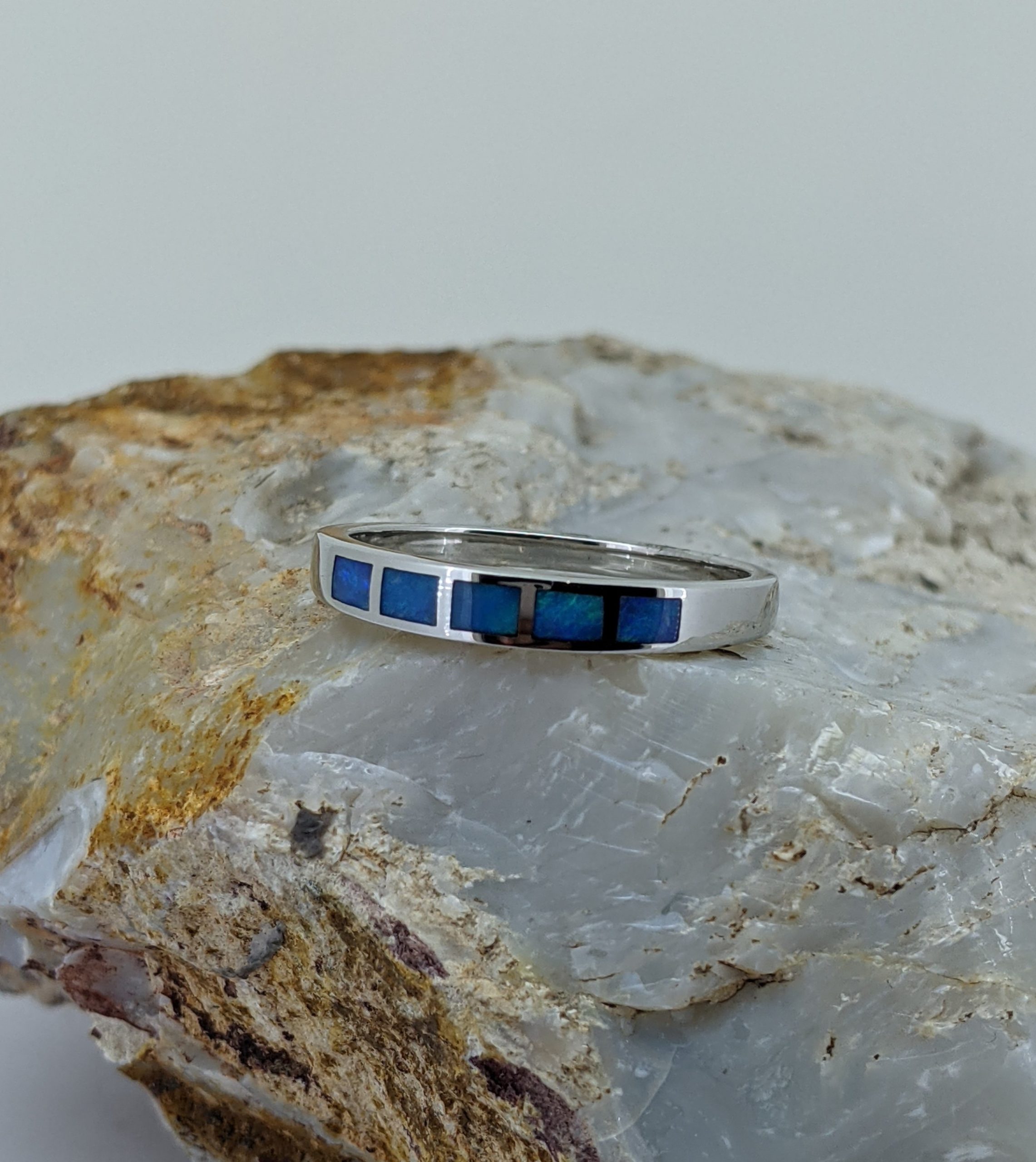 Solid natural white opal sourced from Coober Pedy, South Australia. This solid white opal ring is crafted in Sterling Silver. The opal has an intense display of the colours blue and green.