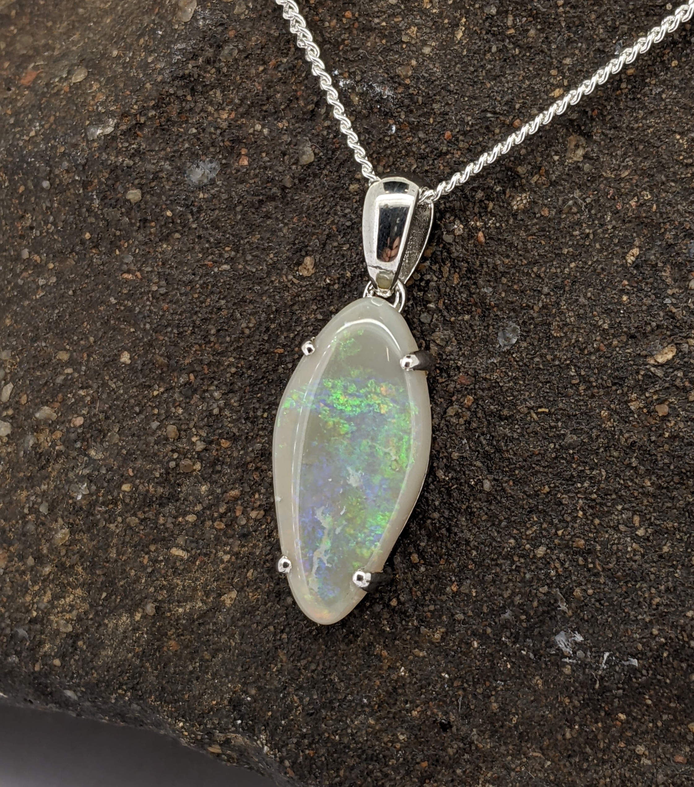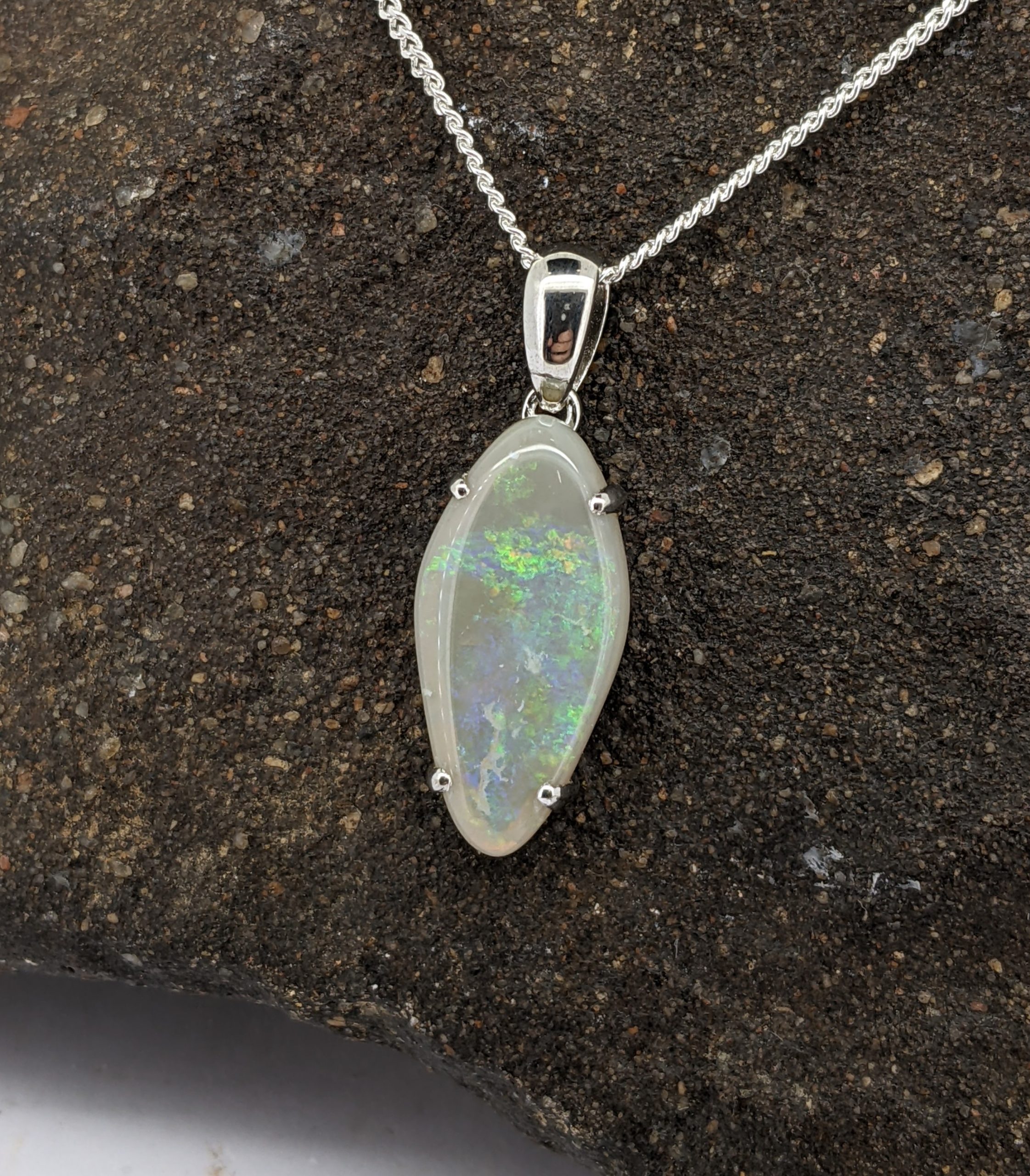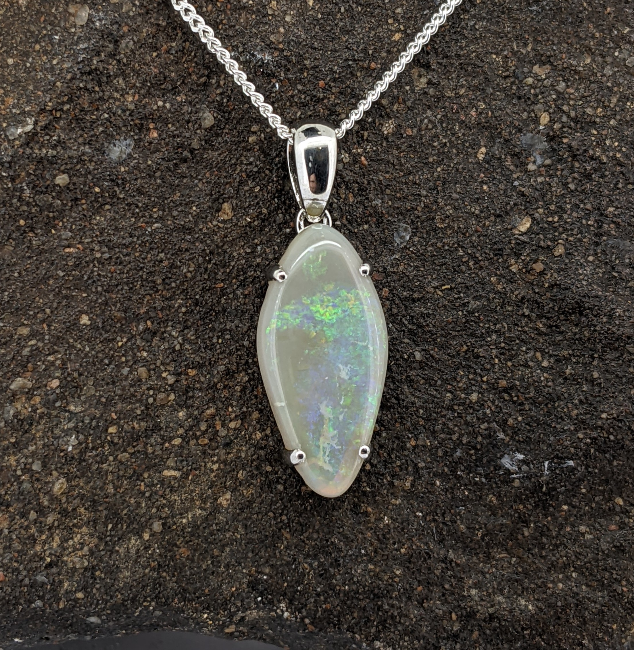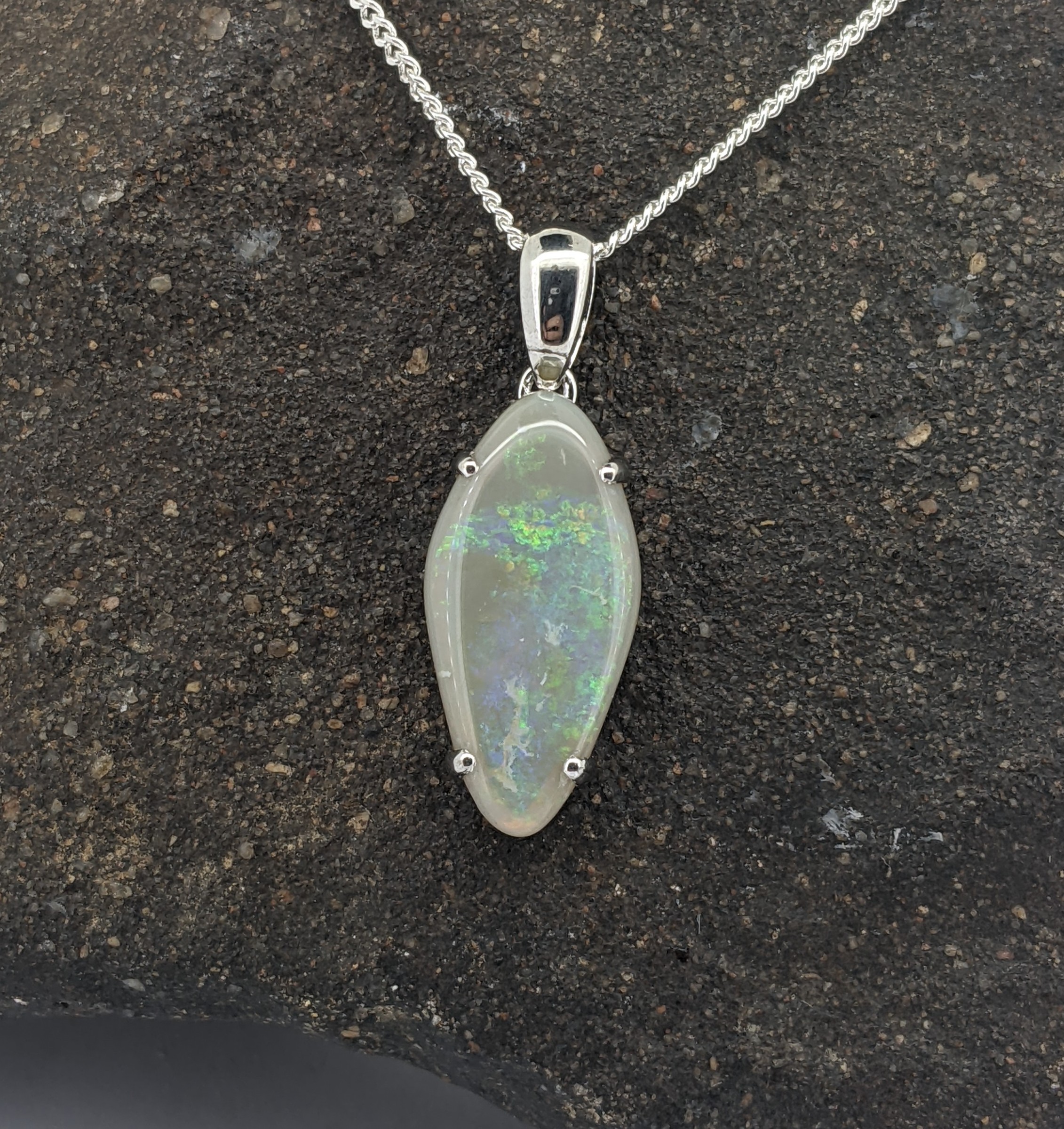 Solid natural white opal sourced from Coober Pedy, South Australia. This solid white opal pendant is set in Sterling Silver. The opal has a strong display of the colours green, yellow and blue.