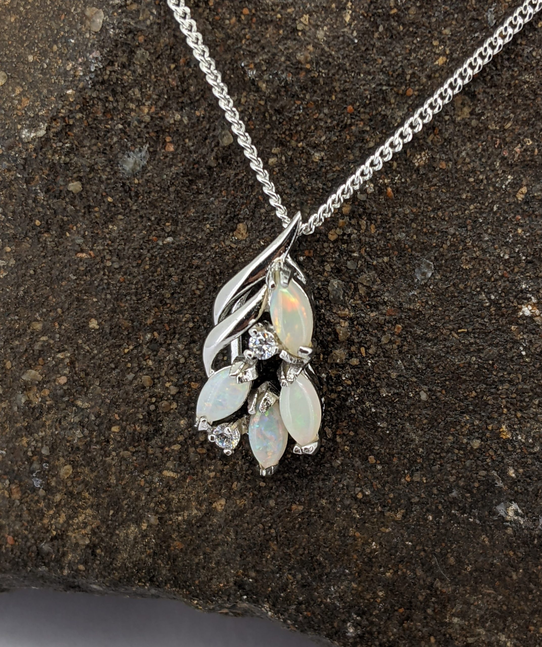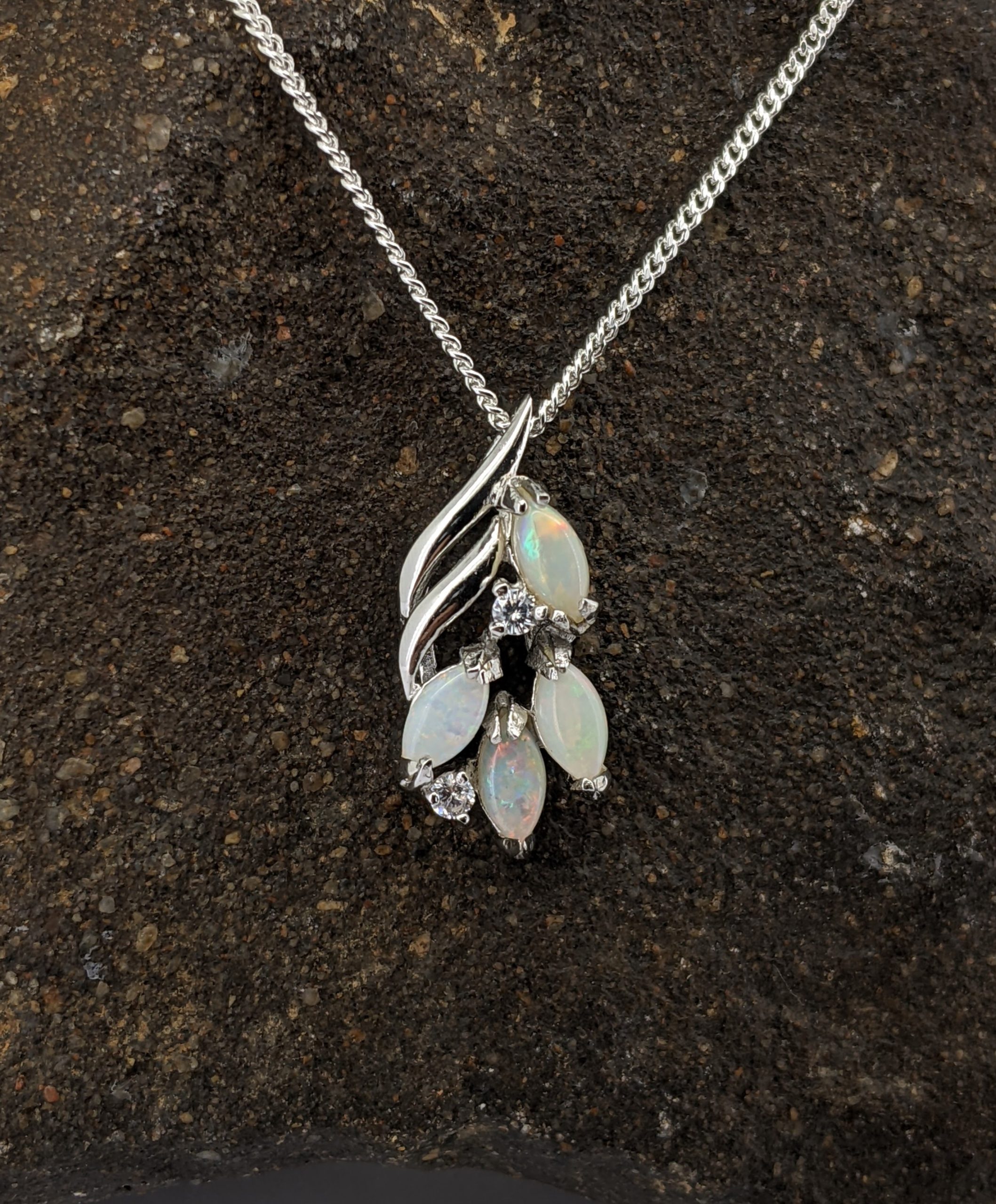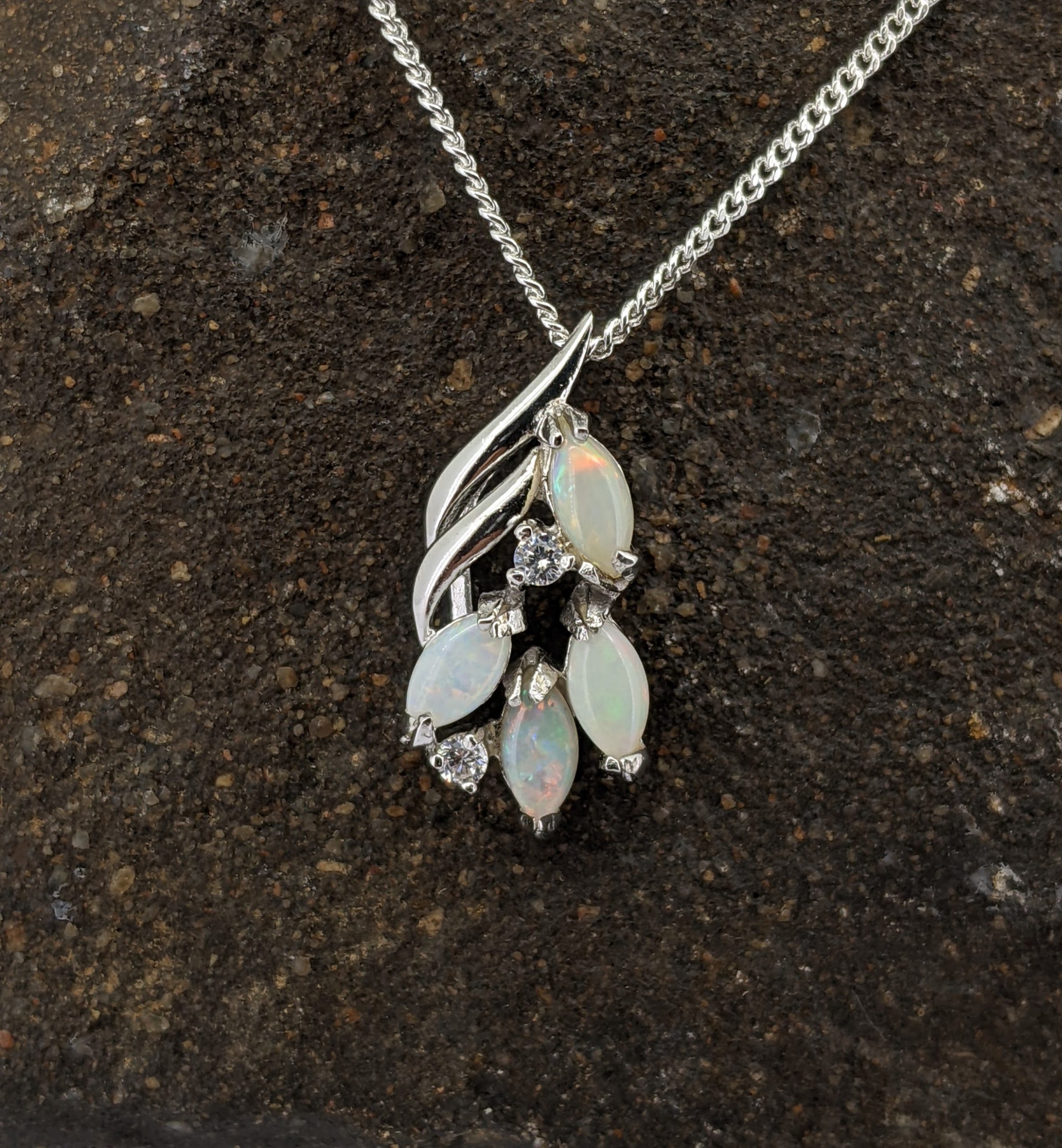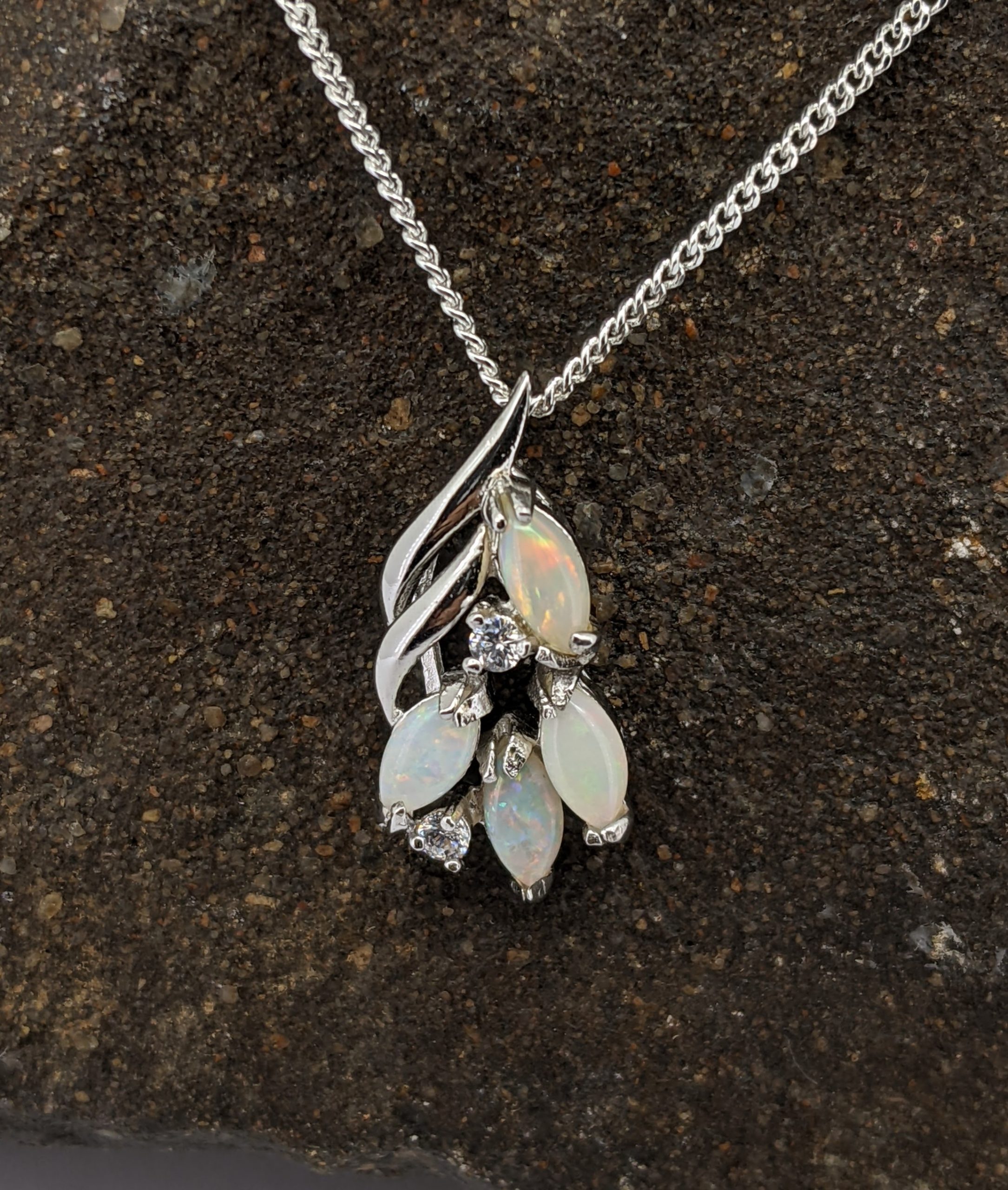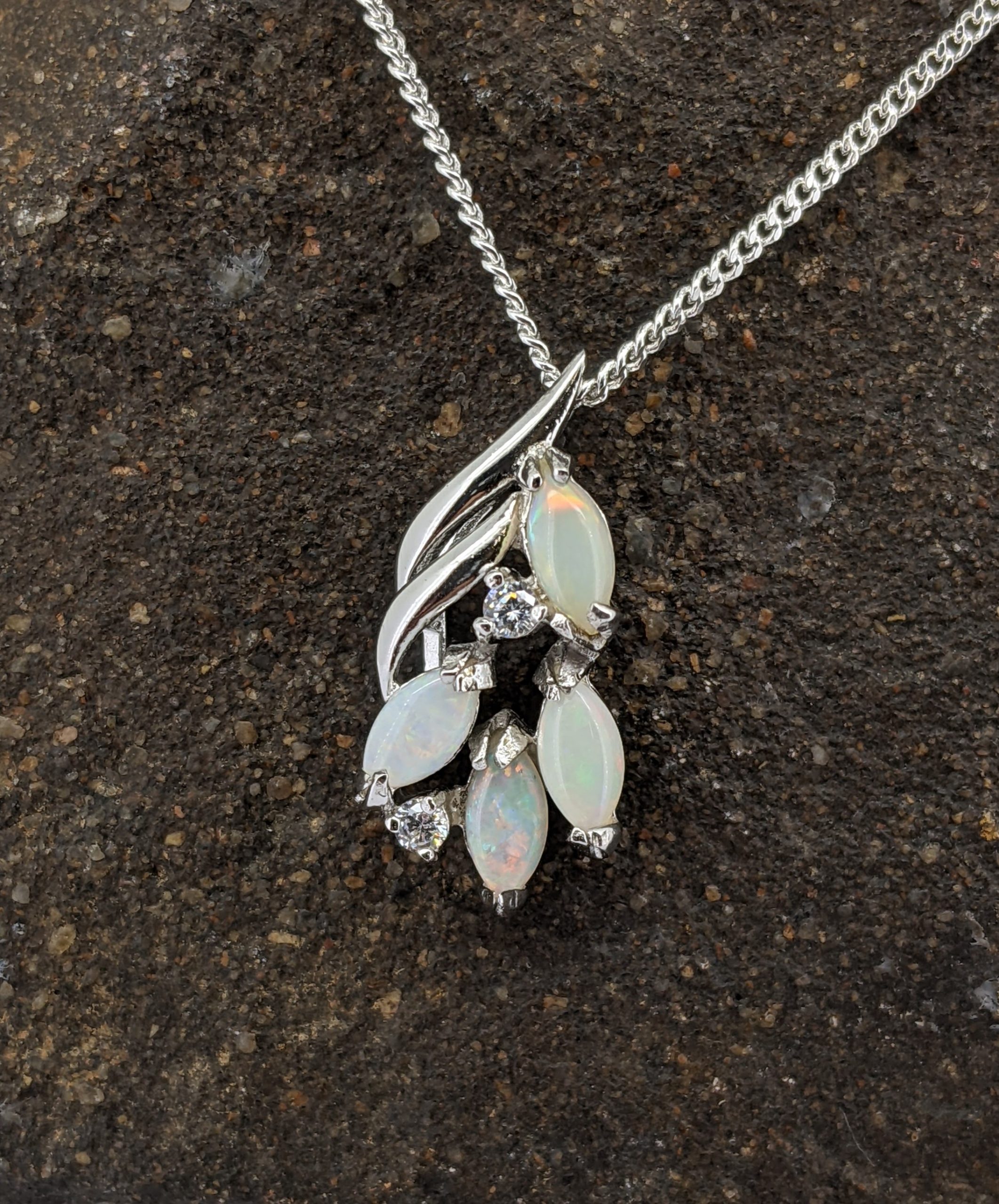 Solid natural white opal sourced from Coober Pedy, South Australia. This solid white opal pendant is set in Sterling Silver. The opals are accentuated by two cubic zirconias. They have a flashy display of the colours red, orange, green and blue.