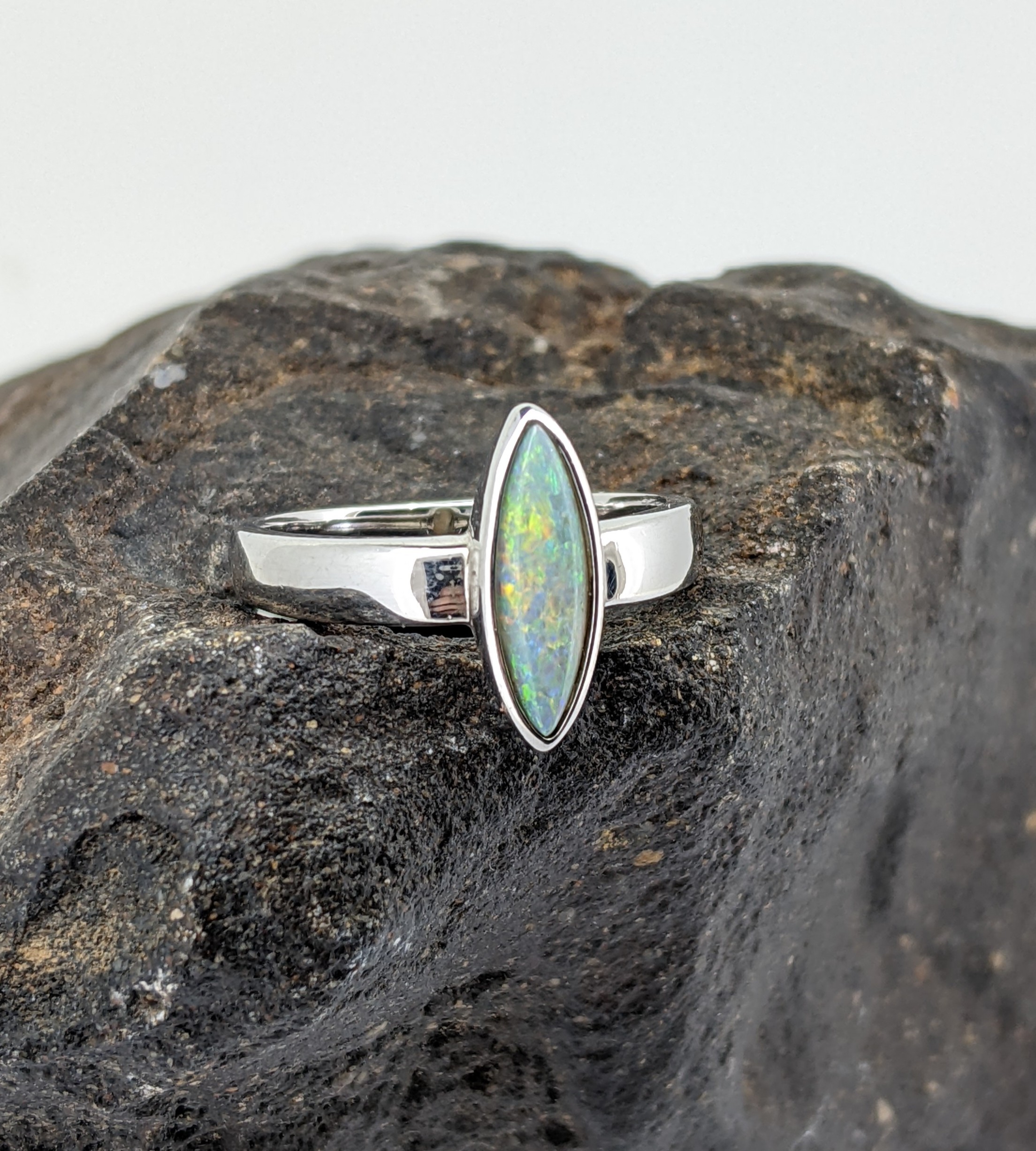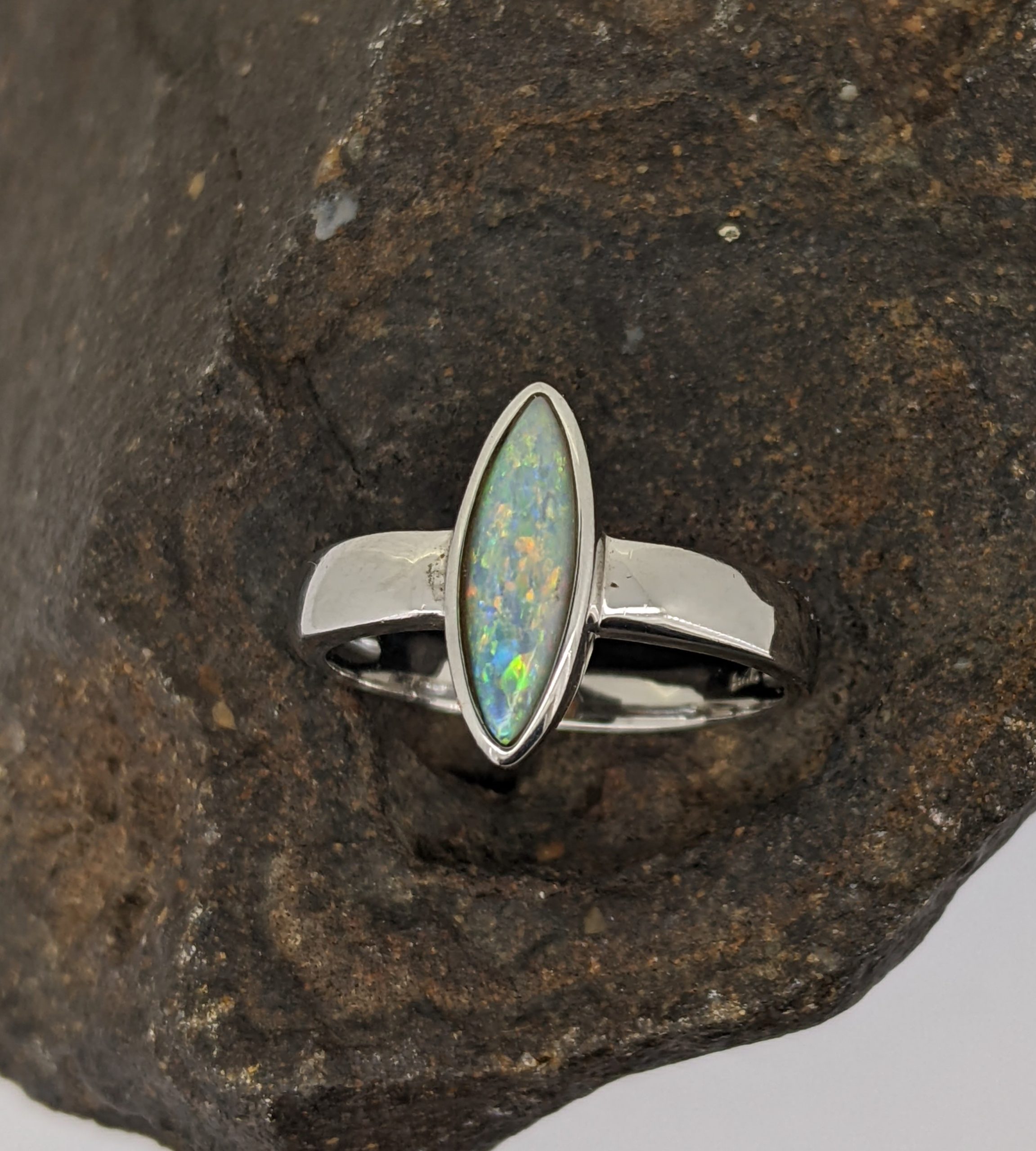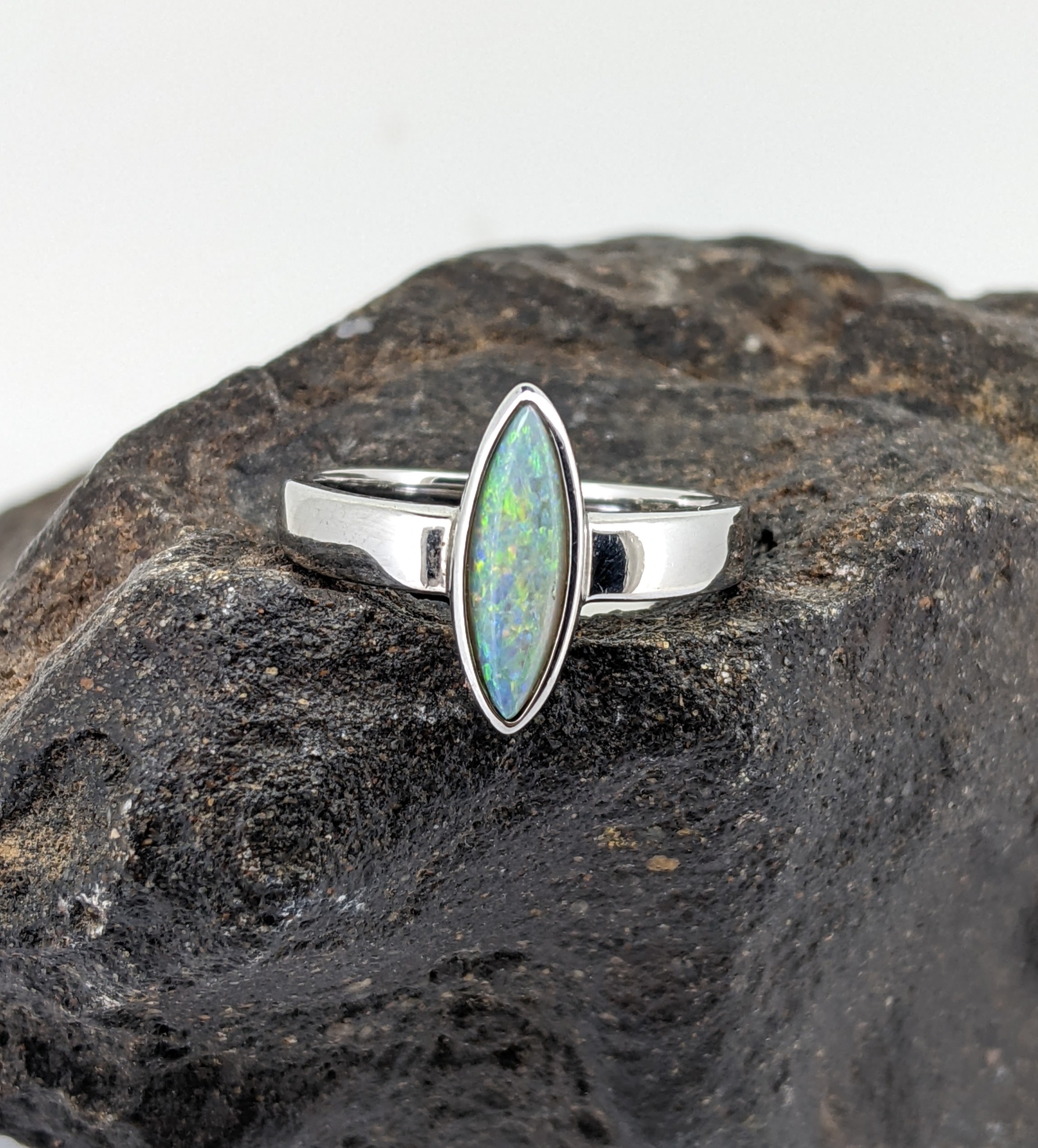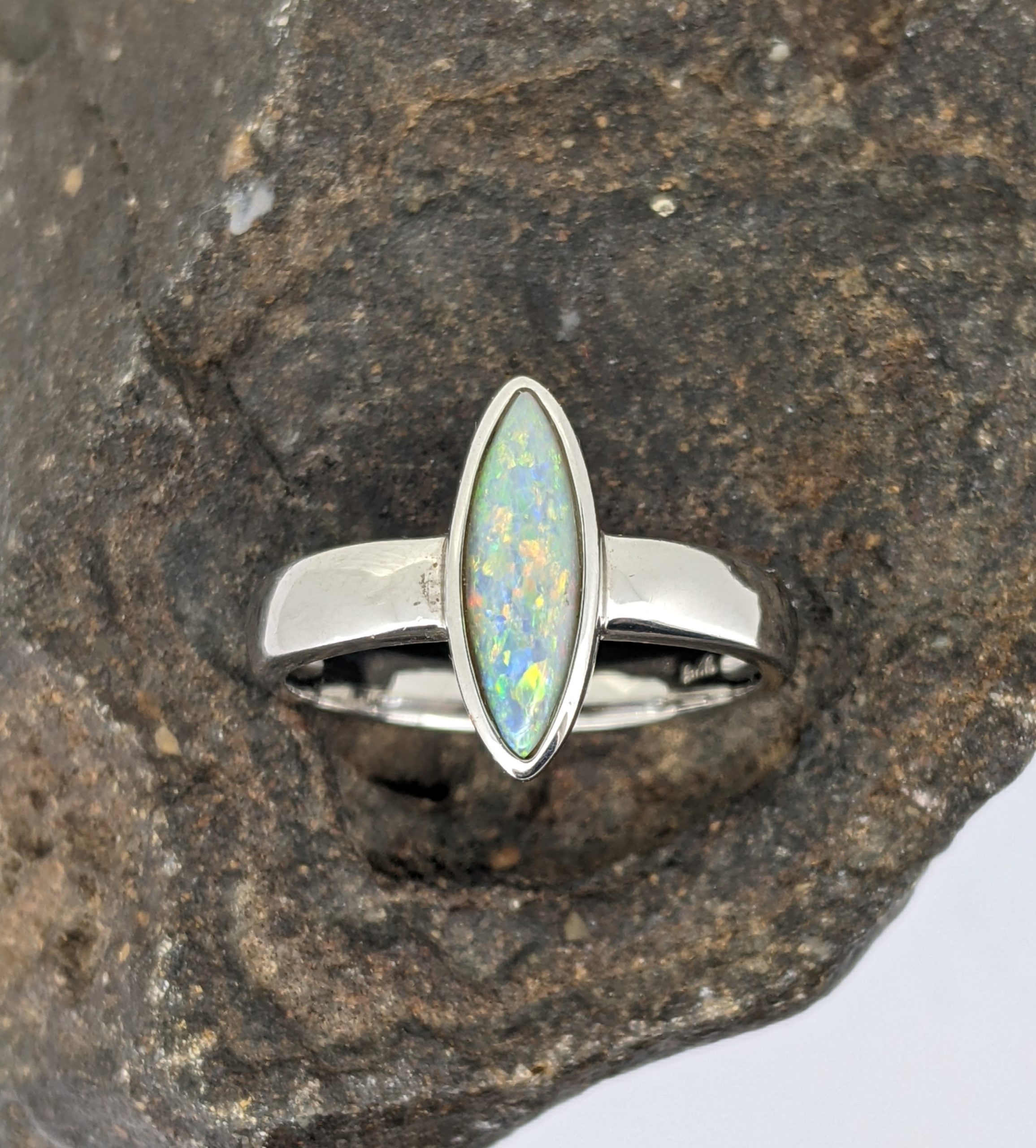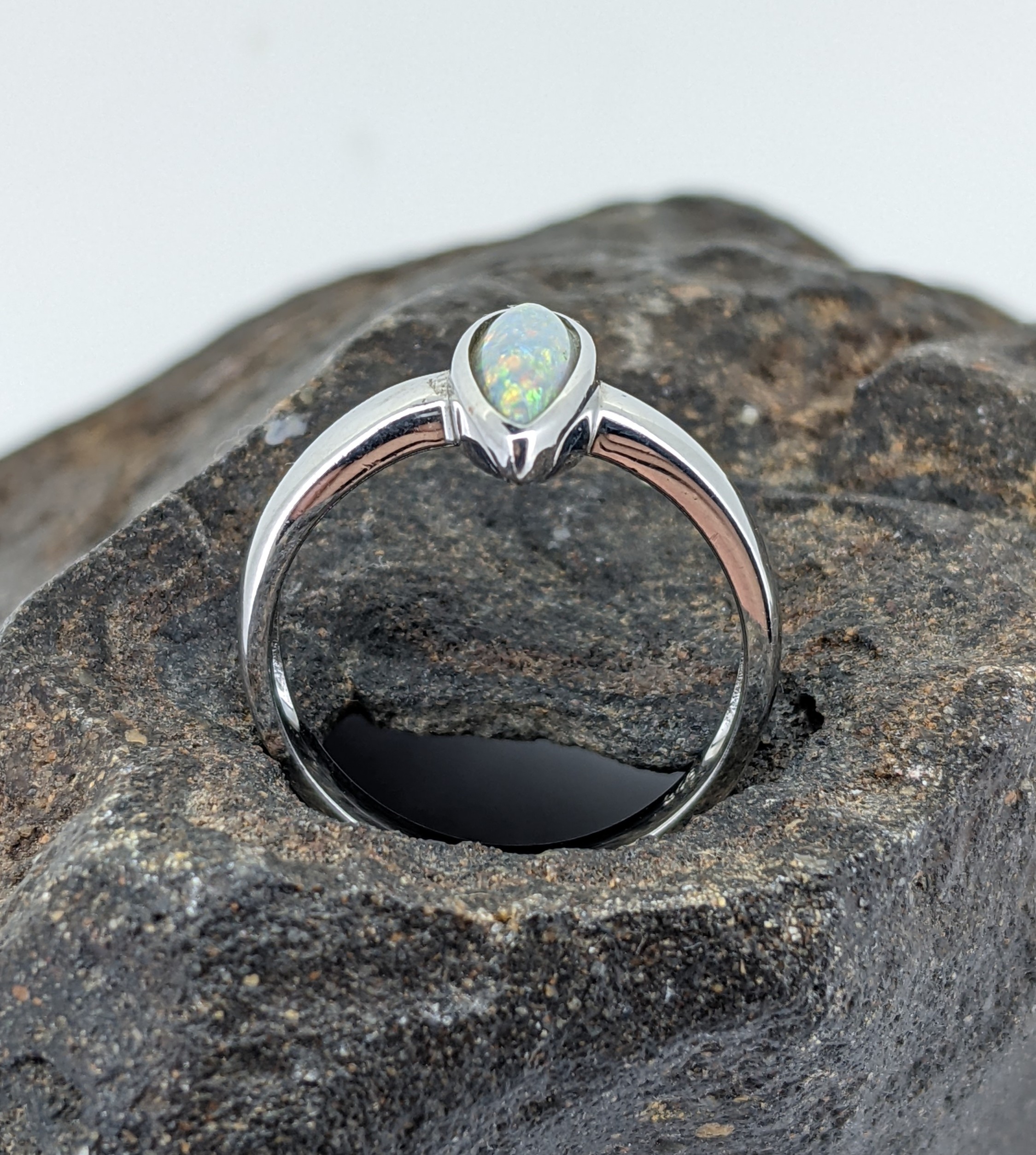 Solid natural white opal sourced from Coober Pedy, South Australia. This solid white opal ring is set in Sterling Silver. The opal has a subtle display of the colours orange, yellow and blue.
