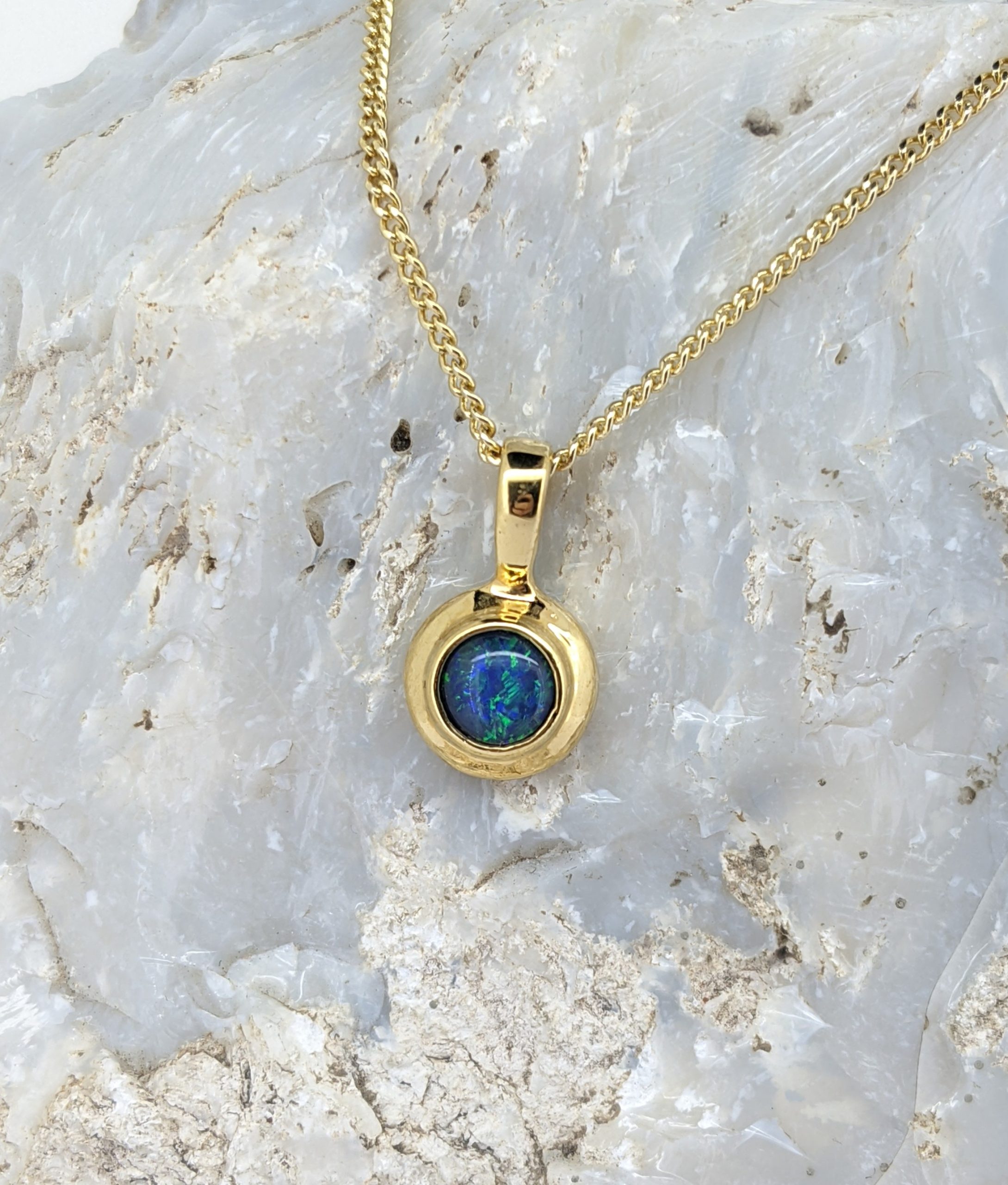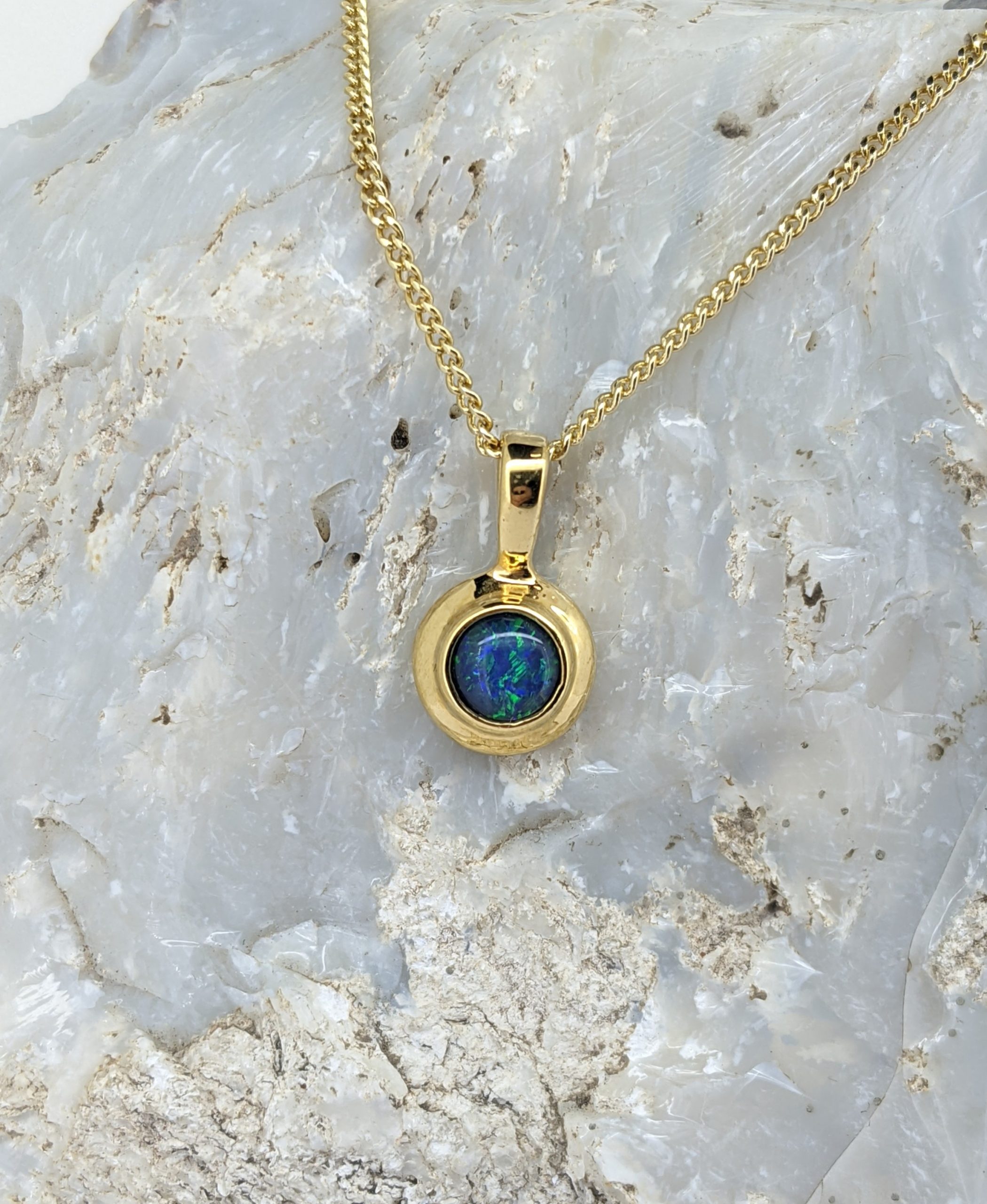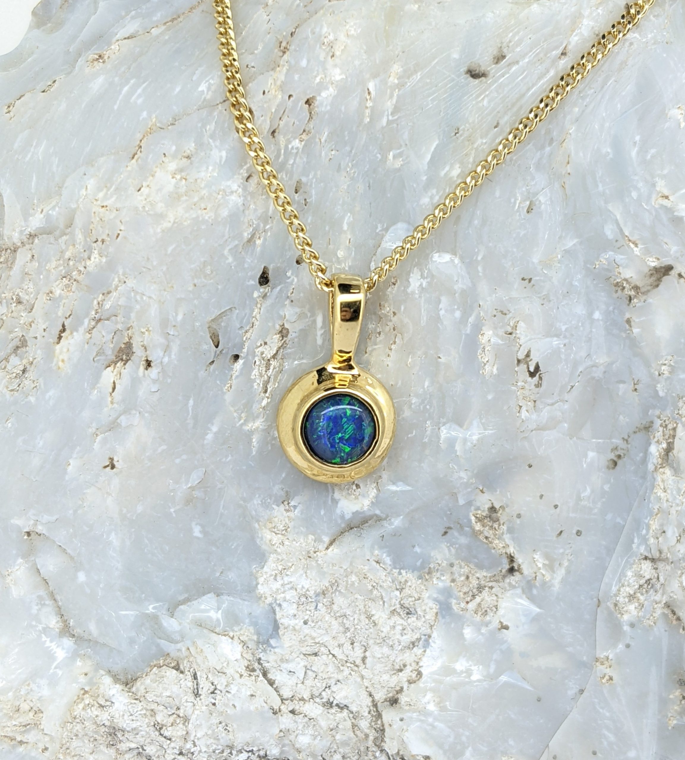 This triplet opal pendant is made with Coober Pedy white opal. It is set in Gold-Plated Sterling Silver and has a strong display of the colours blue and green.