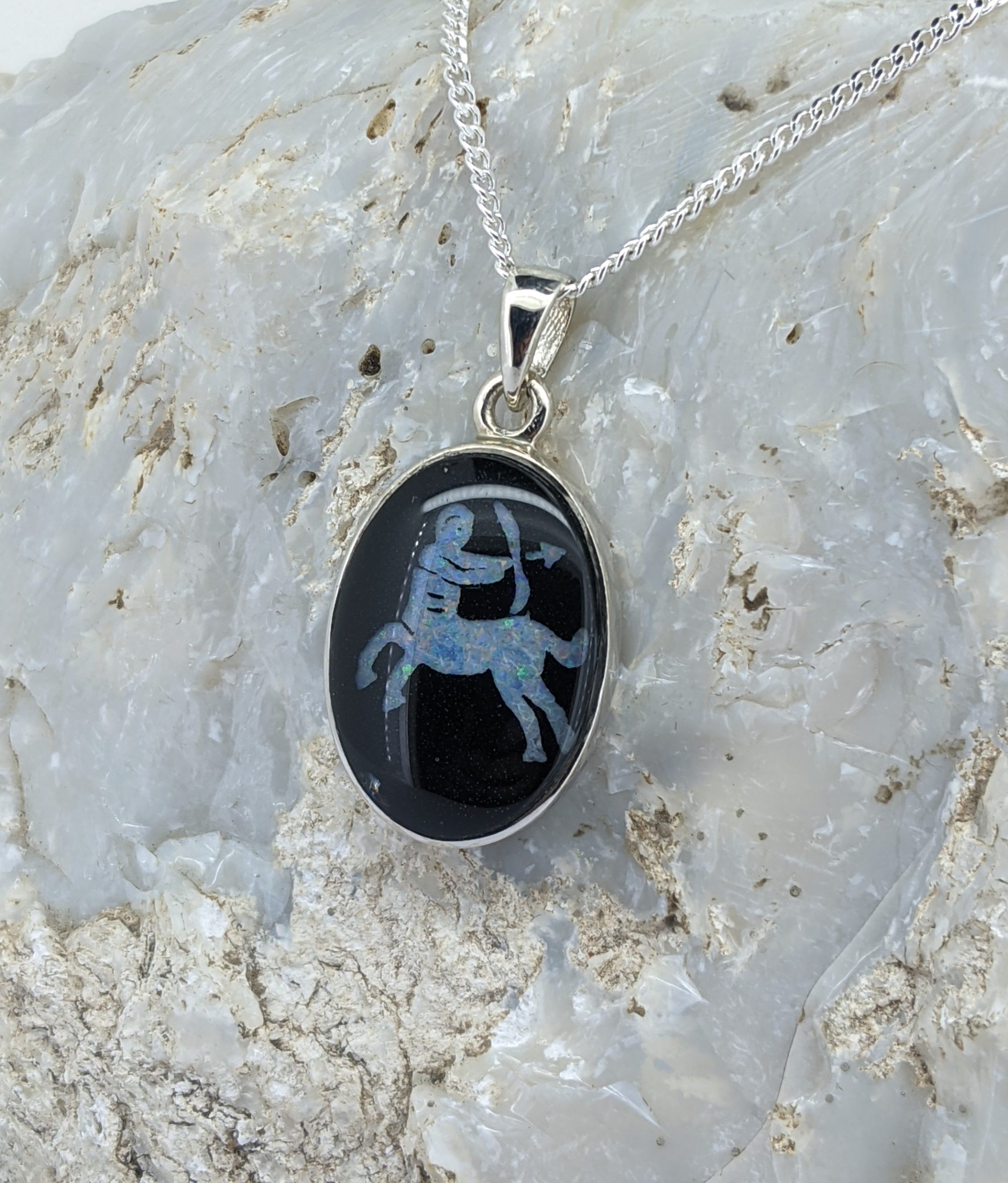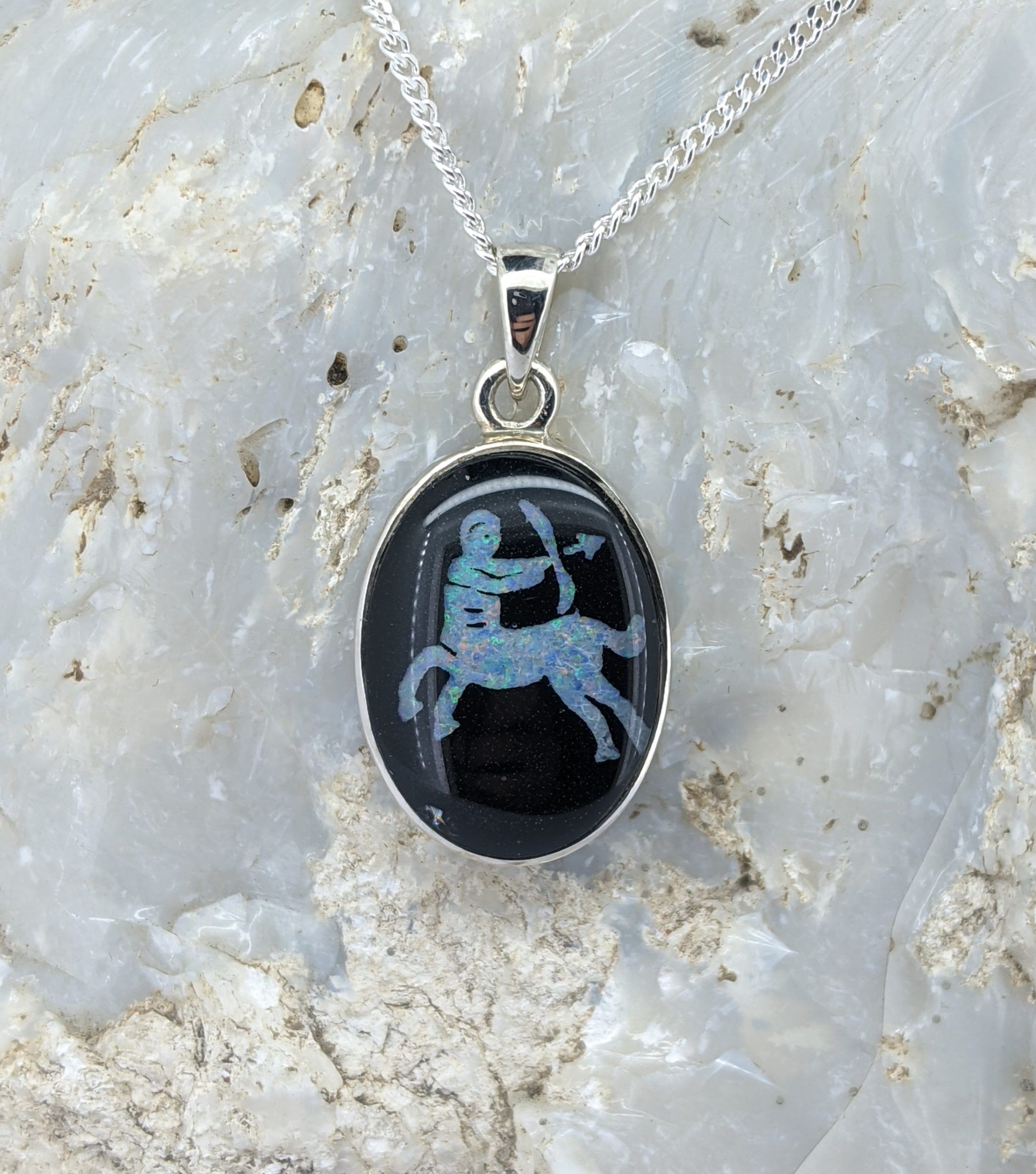 This opal triplet pendant is made with Coober Pedy white opal. It is set in Sterling Silver and has an intense, vibrant display of the colours green and orange.
